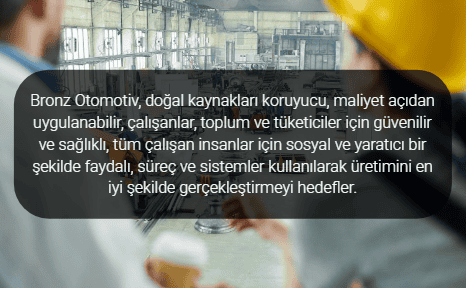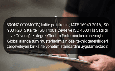 BRONZ OTOMOTİV, kalite politikasını; IATF 16949-2016, ISO 9001-2015 Kalite, ISO 14001 Çevre ve ISO 45001 İş Sağlı...