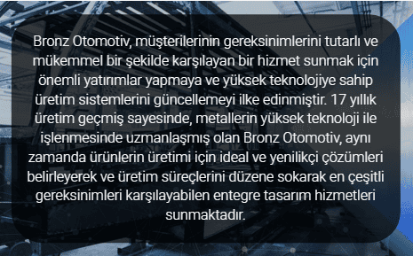 Geleceğe yatırım yapıyoruz! Bronz Otomotiv olarak, üretim tesislerimizi geliştiriyor ve kapasitemizi artırıyoruz. Yenilikçi teknolojilerle donattığımız süreçlerimizle, müşterilerimize daha hızlı ve kaliteli çözümler sunmayı hedefliyoruz. Her adımda çevreye duyarlı yaklaşımlarımızla sürdürülebilir bir gelecek için çalışıyoruz. Gücümüzü sizden alıyor, yarınlara birlikte ilerliyoruz!