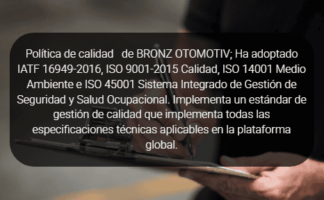 Política de calidad de BRONZ OTOMOTIV; Ha adoptado IATF 16949-2016, ISO 9001-2015 Calidad, ISO 14001 Medio...