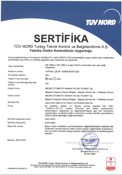 Bu sertifika, system 2+ altında uyumlu standart EN 1090- 1 :2009+A: 1 :2011 ‘in madde ZA’sında tarif edilen performansın devamlılığının doğrulama ve değerlendirmesiyle ilgili tüm hükümlerin uygulandığını ve fabrika üretim kontrolünün burada belirtilen gerekliliklerin tümünü yerine getirdiğini doğrulamaktadır.